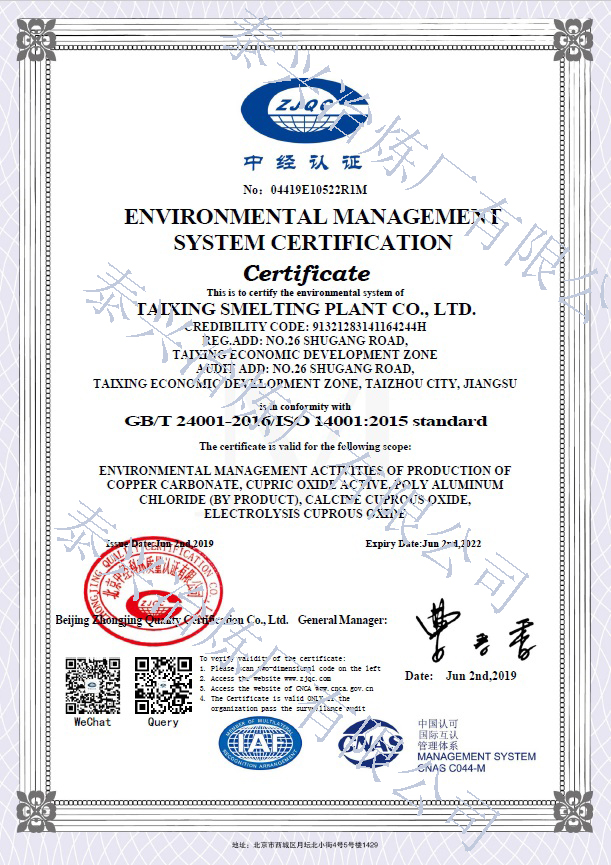 泰興冶煉廠有限公司(原泰興冶煉廠),始建于20世紀70年代初,現位于江蘇省泰興經濟開發區。歷經40年的創新驅動、穩健發展,已成長為一家專業生產堿式碳酸銅、高純電鍍氧化銅、氧化亞銅、氧化銅、無水硫酸銅、海綿銅粉及副產品聚氯化鋁(凈水劑)等系列無機鹽產品及處置不含氨的氯化銅蝕刻液(HW22)15000噸/年的“國家高新技術企業”和地方性骨干企業。公司總占地面積3.7萬平方米,建筑面積4萬平方米,注冊資本2088萬元,固定資產1.2億元,年產值約7億元。